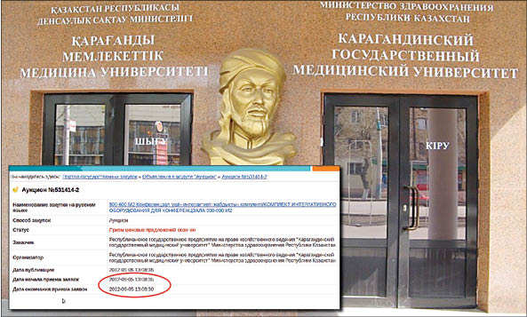 Но успехи в проведении закупок ИЧ-167/3 и Центра судебной экспертизы Министерства юстиции меркнут по сравнению с успехами Республиканского государственного предприятия на праве хозяйственного ведения “Карагандинский государственный медицинский университет” Министерства здравоохранения Республики Казахстан. Этот университет 5 сентября провел аукцион по приобретению комплекта интерактивного оборудования для конференц-зала. Срок, отведенный университетом на прием заявок на аукцион, составил и вовсе рекордные... 3 секунды. Вот это скорость!