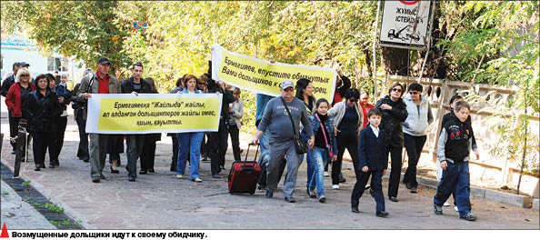 Нестройным маршем по брусчатке элитного района полсотни человек двигались молча. За них говорили неловко несомые растяжки “Ермегияев, впустите обманутых вами дольщиков к себе во дворец!”. О серьезности просьбы гласили и чемоданы, которые тащили несколько человек. Примерно так было и в прошлом году, только тогда вселялись люди с нелегкой долей в отель “Рахат Палас” (кто-то из них разведал, что один из владельцев респектабельной гостиницы - это “тот самый” владелец) (см. “Срочно - в номер!”, “Время” от 26.3.2011 г.).