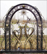 Прежнюю скульптуру, представлявшую собой кованую арку с парой журавлей (на снимке), подарил городу в декабре прошлого года в честь 20-летия независимости страны фонд “Кус жолы”. Садик тут же получил в народе название “cквера любви”, к арке потянулись свадебные кортежи.