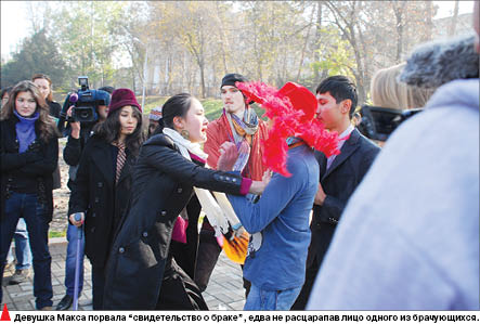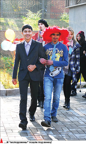 С небольшим опозданием немногочисленные зрители увидели спектакль, продлившийся не более пяти минут. Телибеков с торжественным видом включил старый кассетный магнитофон, со скрипом заигравший марш Мендельсона, и два молодых человека, чьи роли исполнили студенты Академии кино и телевидения Батур ЯКУБОВ и Максим БРЕВНОВ, признались друг другу в любви и пожелали зарегистрировать свои отношения. Церемонию бракосочетания едва не сорвала девушка Макса, чью роль исполняла Назым КАЖЫБАЕВА. С эмоциональностью, которой позавидовала бы и Асель САГАТОВА, молодая актриса устроила драку, порвала “свидетельство о браке” и попыталась расцарапать лицо “жениху” своего парня. Закончилось все хорошо - молодоженов поздравил сам “Обама” в исполнении Аяна БУГИБАЕВА.