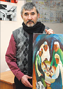 Казахстанские живописцы в массе своей к живому, про которое надо писать, подходят выборочно - для них живо лишь то, что живо расходится по клиентам, а не лежит годами в складской пыли. Горы, речки, жайляу, кони... И вечный той. Оразбек ЕСЕНБАЕВ таких работ тоже не чурается - а то живо писец наступит, - но он же делает и актуальные работы на темы, которые его волнуют. А волнует художника очень многое: от казахской бездеятельности до сложной творческой судьбы отечественного парламента.