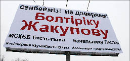 Весьма необычным способом выразила Ассоциация строителей союза “Атамекен” Алматинской области свой протест против нарушения законодательства Казахстана в области строительства и предпринимательства. В среду строители разместили на одной из центральных улиц Талдыкоргана огромный билборд с надписью “Не доверяем начальнику ГАСК Болтирику ЖАКУПОВУ!”.