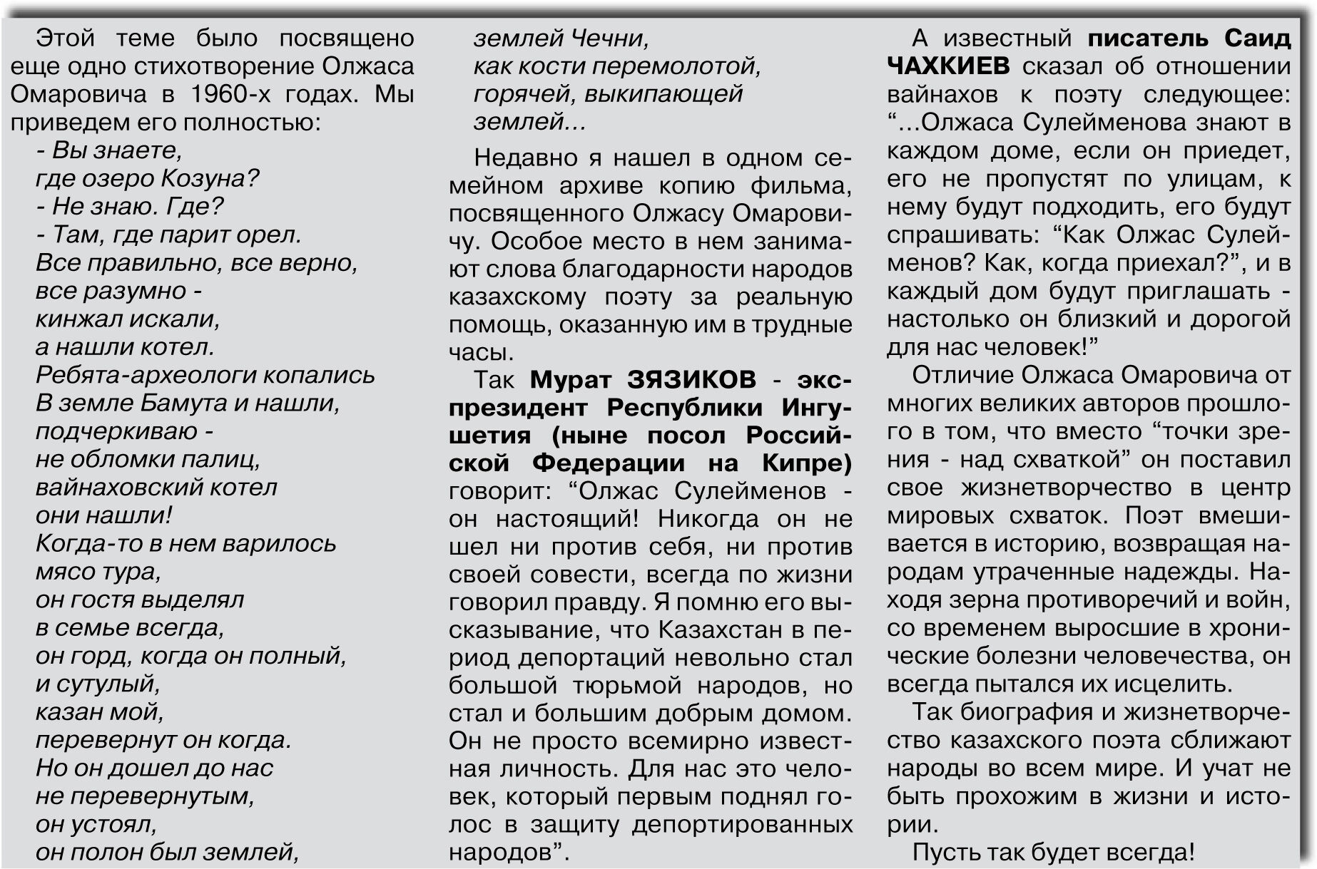 “Я помню все! Казахи отнеслись к нам как к братьям. И сегодня мы шлем братский привет казахскому народу. Огромное спасибо вам! Достаточно вспомнить одного Олжаса СУЛЕЙМЕНОВА, который еще в те годы писал о чеченцах и ингушах…