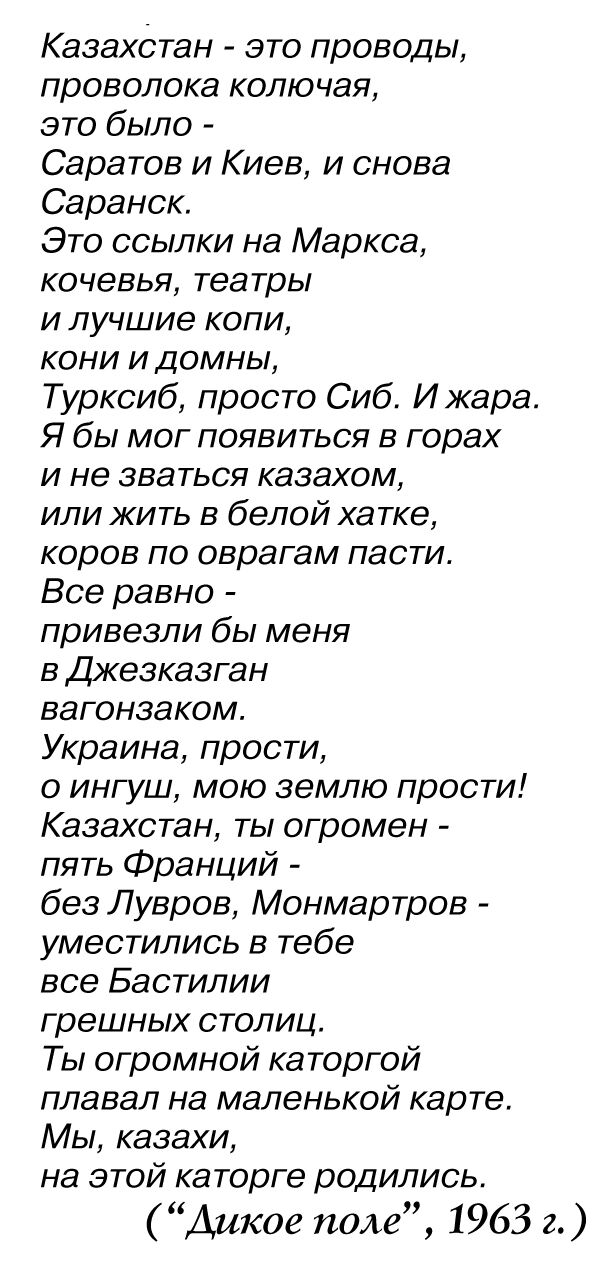 - Мне было восемь лет, когда я впервые увидел в Казахстане чеченцев, ингушей, карачаевцев. Народы, у которых отняли Родину, шли по нашим улицам. В одном из моих ранних стихотворений были такие строки: