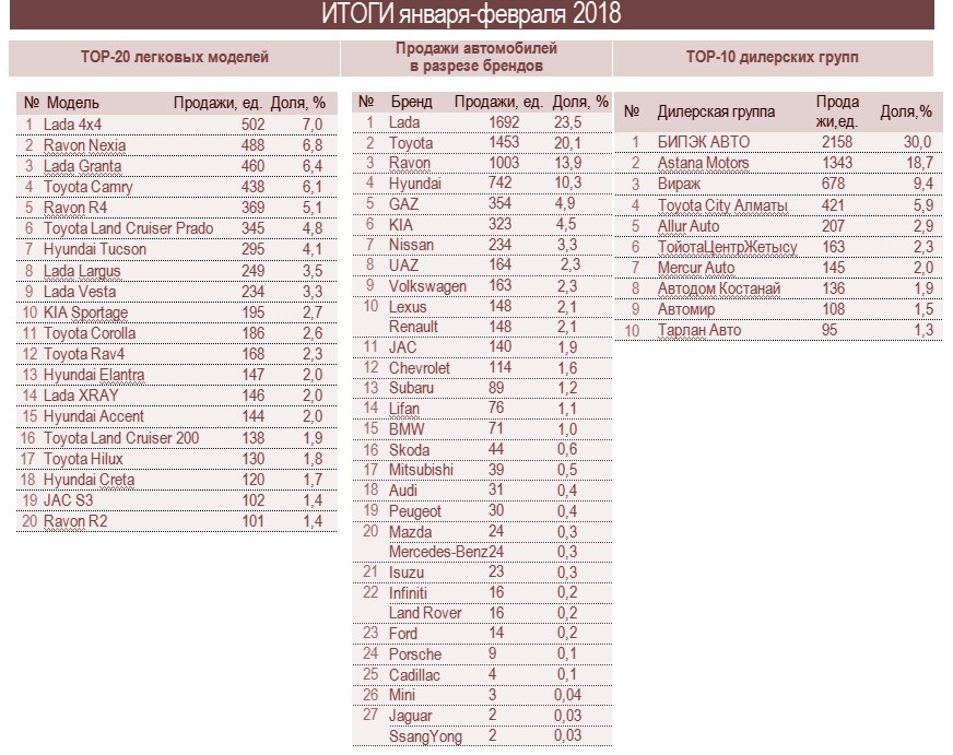 Рейтинг наиболее востребованных казахстанцами брендов по итогам отчетного периода возглавляет Lada: за январь-февраль 2018 г. на территории республики продано 1 692 автомобиля российской марки. Сбыт моделей Toyota составил 1 453 единицы. Третью позицию занял Ravon с показателем 1 003 реализованных автомобилей. Пятерку лидеров замыкают Hyundai (742 ед.) и GAZ (354 ед.). В TOP-10 наиболее успешных марок вошли также KIA (323 ед.), Nissan (234 ед.), UAZ (164 ед.), Volkswagen (163 ед.) и Lexus (148 ед.).
