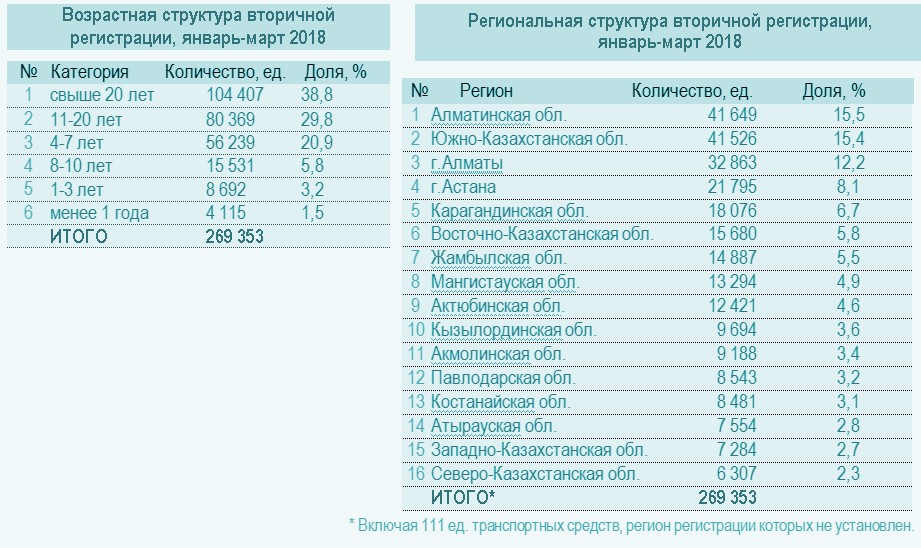 Наибольшее число вторичных регистраций по итогам января-марта 2018 зафиксировано в Алматинской (41 649 ед.) и Южно-Казахстанской (41 526 ед.) областях, г.Алматы (32 863 ед.). Жители Алматинской области также зарегистрировали наибольшее количество транспортных средств в возрасте старше 20 лет (22 668 ед.; 21,7%). Следом по этому критерию расположились Южно-Казахстанская (17 822 ед.; 17,1%) и Жамбылская области (8 591 ед.; 8,2%). Наибольшее число транспортных средств моложе одного года зарегистрировано в гг. Алматы (787 ед.; 19,1%), Астане (733 ед.; 17,8%) и Южно-Казахстанской области (354 ед.; 8,6%).