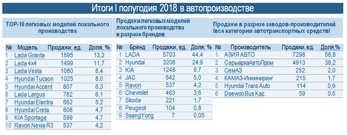 Пятёрку наиболее востребованных брендов легковых авто казахстанской сборки по итогам I полугодия составили Lada (5 703 ед.), Hyundai (3 206 ед.), KIA (1 248 ед.), JAC (642 ед.) и Ravon (537 ед.). В список марок, предлагаемых отечественными предприятиями, вошли также Chevrolet (463 ед.), Skoda (221 ед.), Peugeot (104 ед.) и SsangYong (7 ед.).