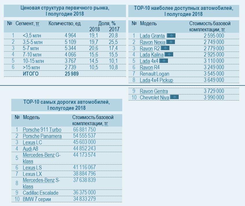 Большинство позиций в рейтинге наиболее доступных легковых моделей приходится на предложения казахстанских автопроизводителей. Так лидером ценовой доступности стала Lada Granta усть-каменогорского производства, стоимость которой стартует от 2,59 млн тг. В ТОР-10 самых доступных авто вошли также Ravon Nexia (2,75 млн тг), Ravon R2 (2,78 млн тг), Lada Kalina (2,93 млн тг), Lada 4x4 (3,1 млн тг), Ravon R4 (3,25 млн тг), Renault Logan (3,55 млн тг), Lada 4x4 Pickup (3,65 млн тг), Ravon Gentra (3,73 млн тг) и Chevrolet Niva (3,99 млн тг).