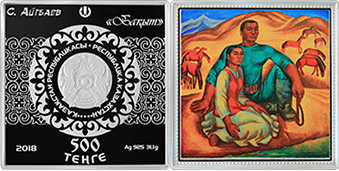 «В верхней части монеты логотип Национального банка. Слева от логотипа надпись «C. Айтбаев», справа – «Бақыт». В нижней части монеты надпись «500 теңге», обозначающая номинал. Слева от нее надпись «2018», обозначающая год чеканки, справа надписи «Ag 925» и «31,1g», обозначающие металл, из которого изготовлена монета, его пробу и массу. На оборотной стороне монет – миниатюра картины «Бақыт» казахстанского художника Салихитдина Айтбаева», - рассказали в Нацбанке.