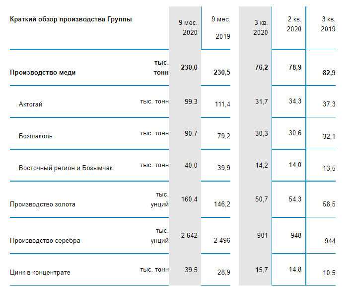В третьем квартале 2020 года Группа KAZ Minerals достигла высоких производственных результатов и за девять месяцев произвела 230 тыс. тонн меди (9 мес. 2019: 230,5 тыс. тонн), несмотря на связанные с COVID-19 сложности. Группа планирует достичь верхних границ плановых диапазонов производства меди и золота, прогноз производства серебра и цинка пересмотрен в сторону повышения.
