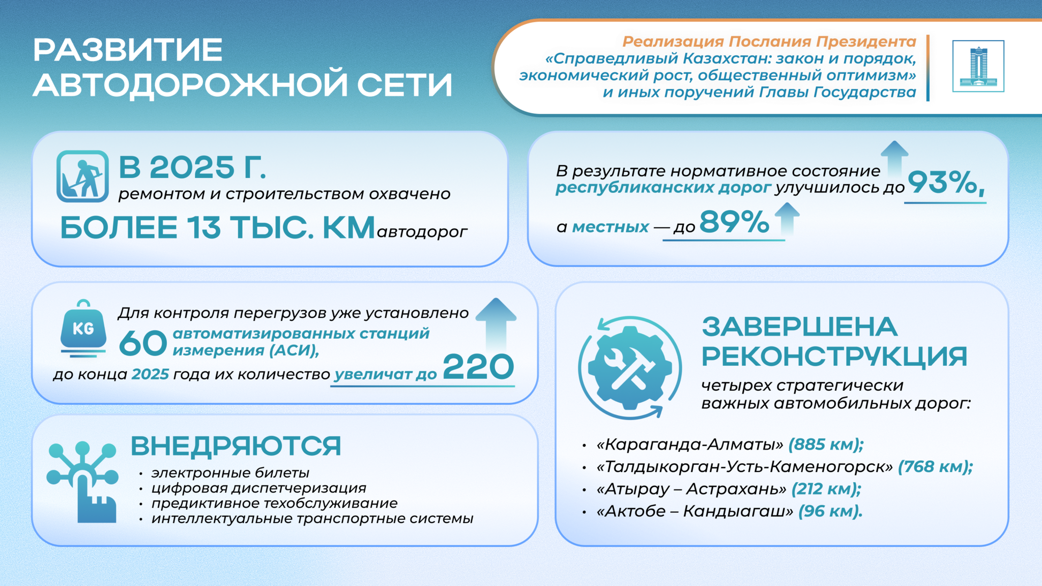 В целом, масштабные проекты в сфере автомобильных дорог, железнодорожных магистралей, авиационной и портовой инфраструктуры уже дают ощутимые результаты, укрепляя позиции Казахстана как ключевого транзитного хаба Евразии. Правительством обеспечивается системный контроль за исполнением поручений Главы государства. Каждый этап строительства и модернизации находится под постоянным мониторингом, что позволяет своевременно устранять «узкие» места и достигать поставленных целей. В ближайшие годы планируется дальнейшее расширение транспортной сети, внедрение современных цифровых решений и привлечение инвестиций.