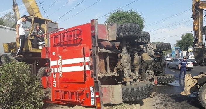 Направлявшаяся на вызов пожарная машина перевернулась в Алматы, сообщает корреспондент агентства.