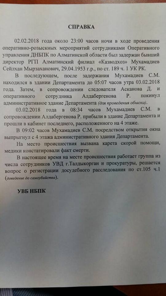 В ней сообщается, что Мухамадиев С.М., 29.04.1953 г.р., был задержан оперативниками 2 февраля 2018 года около 23.00 (по другой информации был задержан в 10.20 утра - КазТАГ) и находился в здании финпола до 5.17 следующего дня. Затем в сопровождении следователя Д. Асканова и оперативного сотрудника Рауана Алдабергенова покинул здание для проведения обыска. В 8.34 задержанный вместе с оперативником Р. Алдабергеновым прибыл в адмздание финпола и прошел в кабинет последнего на 4 этаже. В 9.02 С.Мухамадиев выпрыгнул из окна. На место происшествия была вызван а карета скорой помощи, медики констатировали факт смерти.