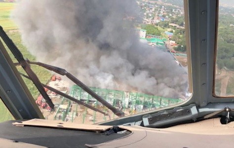 «По прибытию к месту вызова первых противопожарных подразделений установлено, что происходит открытое горение складских помещений на ориентировочной площади 3 тыс. кв.м. В ходе тушения пожара был задействован вертолет Ми-171 «Казавиаспас» комитета по чрезвычайным ситуациям с водосливным устройством, каждый сброс составлял по 3 тонны. Тушение пожара осложнялось сильным задымлением, отсутствием источников водоснабжения на территории объекта. Подвоз воды производился шестью автоцистернами с водоемов, расположенных на удалении 3 км», - уточняется в сообщении.