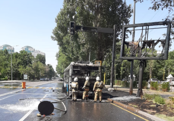 Автобус и рекламный щит сгорели в Алматы, пострадал водитель