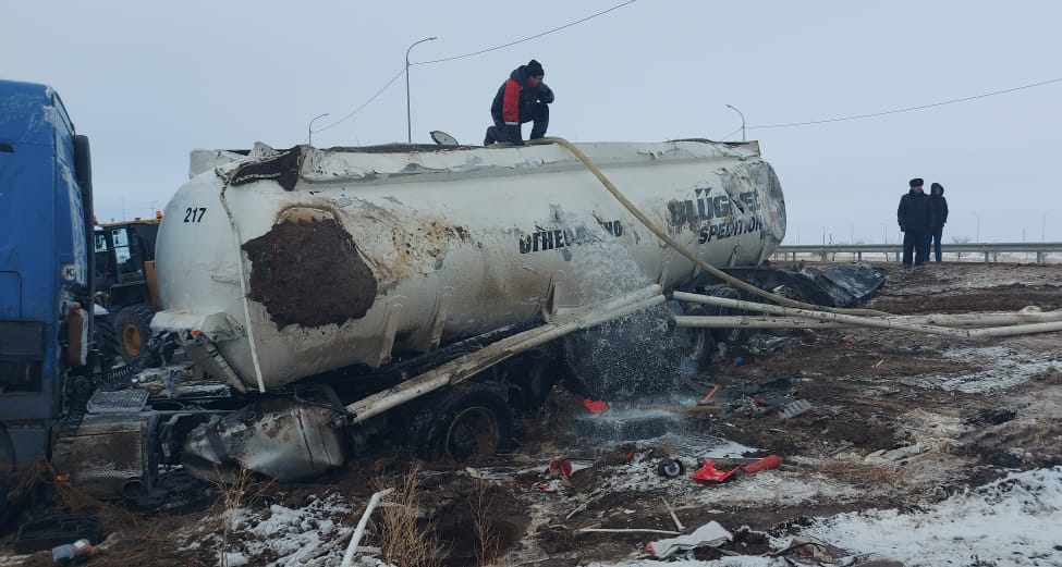 «15 ноября в 22.08 на пульт «101» поступило сообщение о дорожно-транспортном происшествии на трассе Кызылорда-Павлодар. В районе села Береке Аксуского района автомобиль Mercedes-Benz Actros с цистерной, заправленной дизельным топливом на 38 тыс. литров, сбил на дороге корову и опрокинулся в кювет. Произошел розлив дизельного топлива на площади 150 кв.м», - сообщили во вторник в департаменте по чрезвычайным ситуациям (ДЧС) Павлодарской области.