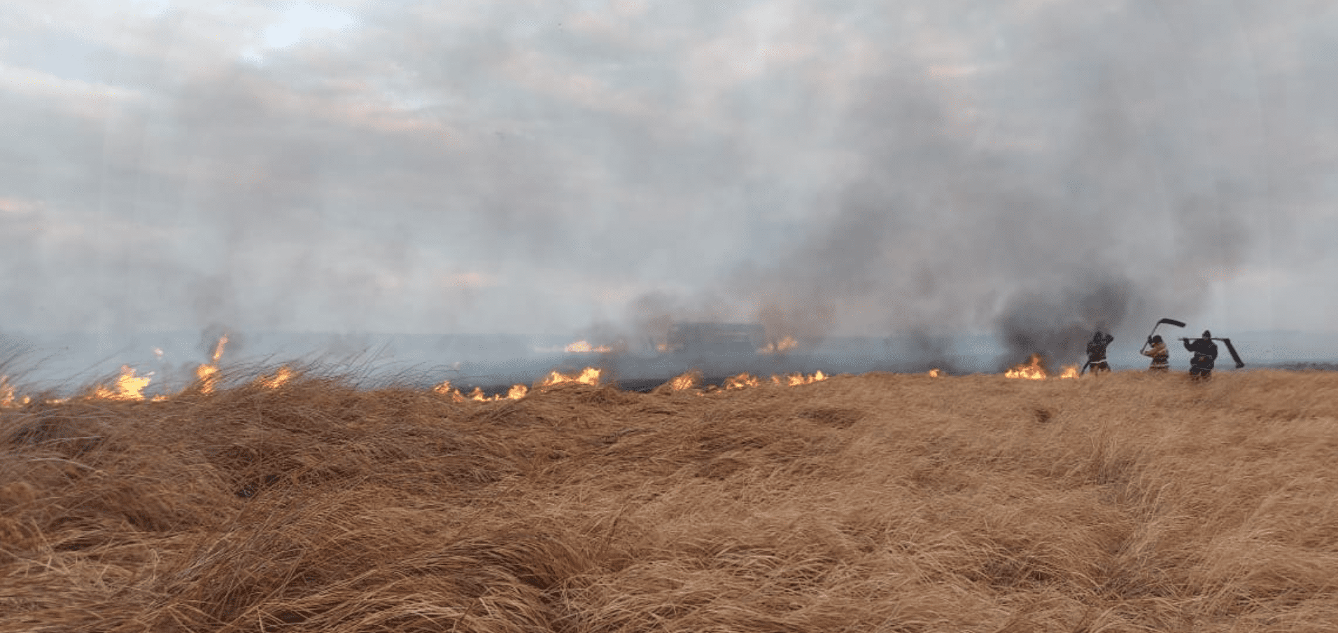 В Баскольском сельском округе Майского в пойме Иртыша горит свежескошенное сено ориентировочно 70 тонн, сухая трава, камыш на пяти разрозненных очагах: 15 га, 25 га, 37 га, 39 га и 24 га.