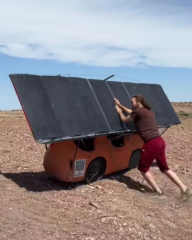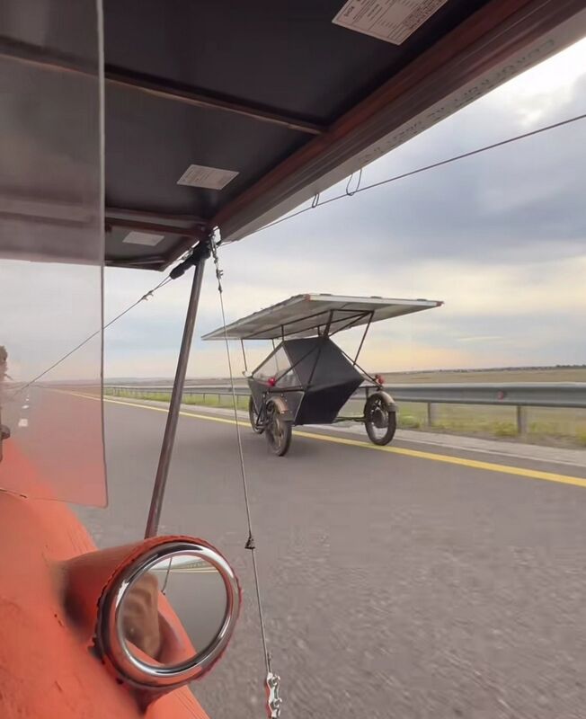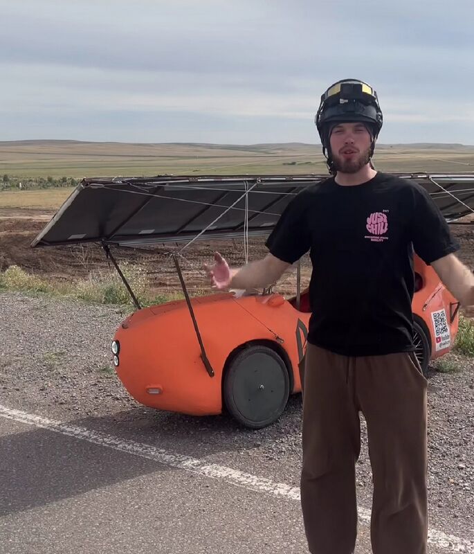 За путешествием товарищей следят сотни подписчиков по всему свету. Кстати, сопровождают ребят в пути их товарищи - на электромопеде и фургончике "буханка". Все нужное в дороге в легкую конструкцию солнцемобиля не помещается.