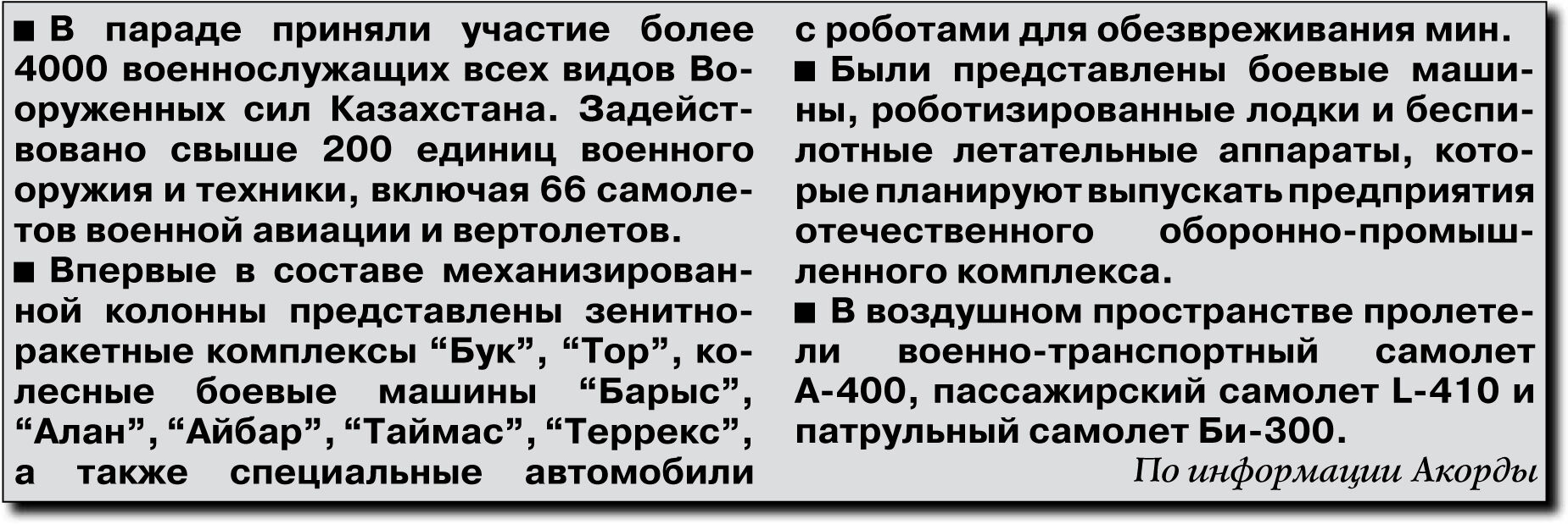 Перед трибунами прошли представители всех родов войск Вооруженных сил страны. Но нельзя не отметить отдельно парадный расчет женщин-военнослужащих - достойных последовательниц Маншук МАМЕТОВОЙ и Алии МОЛДАГУЛОВОЙ. Женщины доказали свое право участвовать в главном строевом смотре юбилейного года, пройдя через все испытания службы. В расчете маршировали участницы и победительницы армейских международных игр, различных учений и конкурсов. В честь их побед гимн Казахстана звучал на стадионах многих стран.