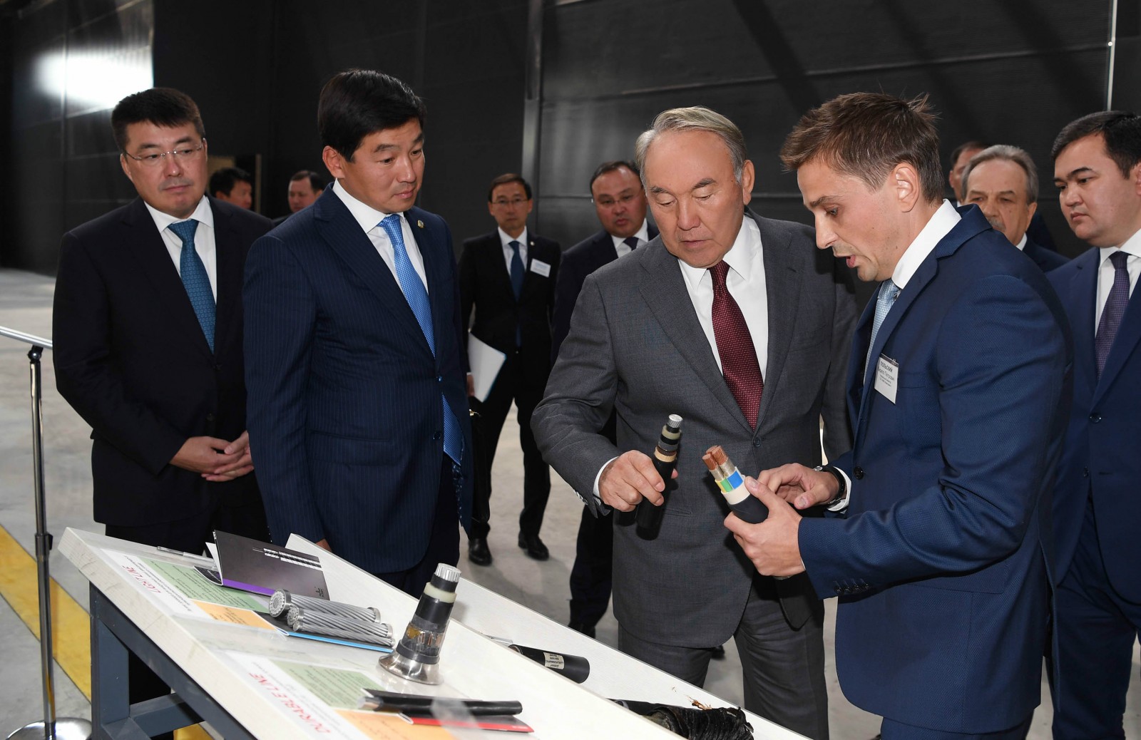 Также Н. Назарбаев ознакомился с производственным циклом завода ТOO «КМК Investment» по изготовлению высокотехнологичной кабельно-проводниковой продукции, а также осмотрел образцы выпускаемых изделий.