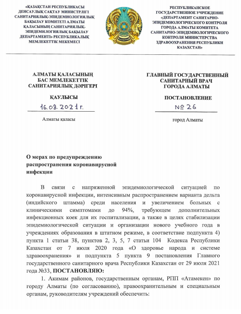 Новое постановление в связи с напряженной эпидемиологической ситуацией в Алматы подписал главный государственный санитарный врач города Жандарбек Бекшин.