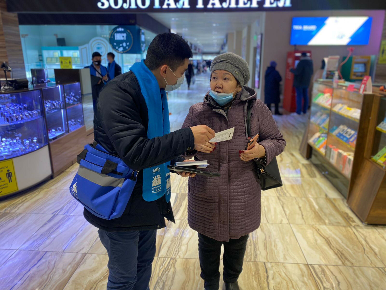 Сотрудники Департамента Бюро национальной статистики, интервьюеры, волонтеры раздавали буклеты, отвечали на вопросы, наглядно демонстрировали на планшетах, как регистрироваться, помогали всем желающим пройти перепись онлайн.