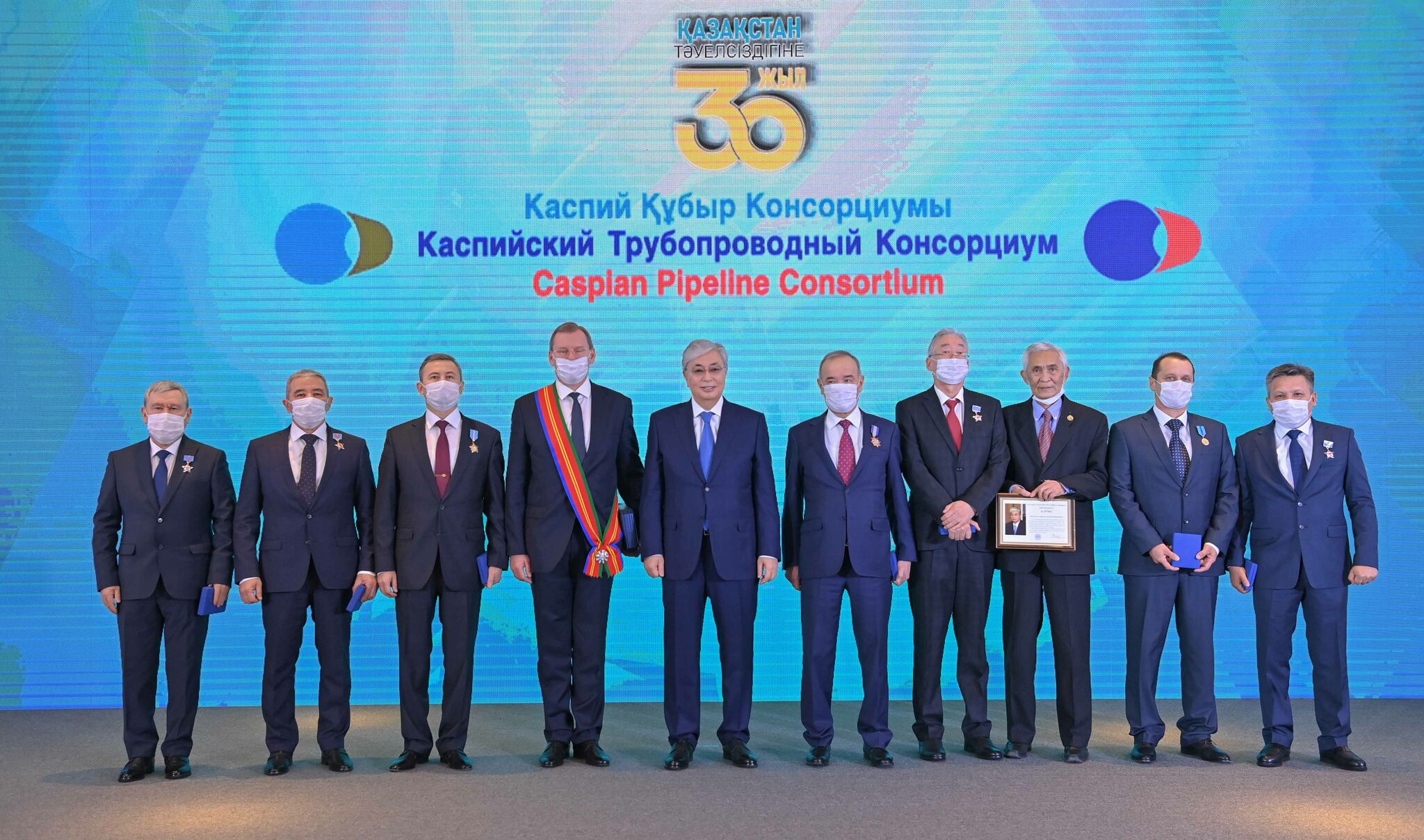 Ряд ветеранов и сотрудников Каспийского трубопроводного консорциума был отмечен государственными наградами. Касым-Жомарт Токаев лично вручил награды.