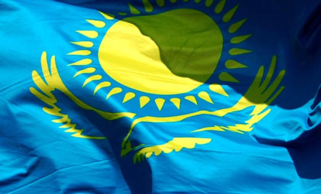 Государственный флаг Республики Казахстан представляет собой прямоугольное полотнище голубого цвета с изображением в центре солнца с лучами, под которым парящий орел. У древка вертикальная полоса с национальным орнаментом. Изображение солнца, его лучей, орла и национального орнамента цвета золота.