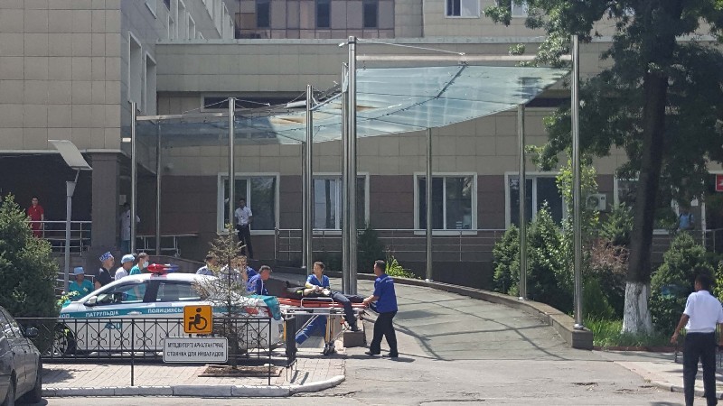 В ходе посещения акимом больницы родственнице одного из пострадавших понадобилась помощь. Ее увезли на каталке.
