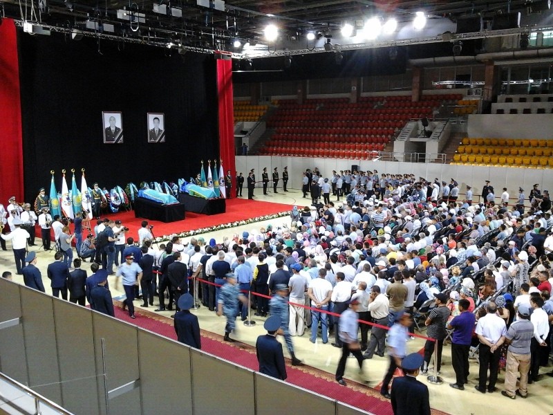 В Алматы прощаются со старшиной полиции, полицейским второго батальона полиции Аяном Галиевым и бывшим сотрудником МВД РК Гани Нуримановым, которые погибли при теракте 18 июля.
