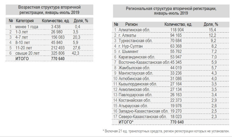 Наибольшее число вторичных регистраций по итогам 7 месяцев 2019 года зафиксировано в Алматинскойобласти (118 904 ед.),г. Алматы (94 165 ед.) и Туркестанской области (70 684 ед.). Жители Алматинской области также зарегистрировали наибольшее количество транспортных средств в возрасте старше 20 лет (68 314 ед.; 21,0%). Следом по этому критерию расположились Туркестанская область (34 876 ед.; 10,7%) и г. Алматы (27 642 ед.; 8,5%). Наибольшее число транспортных средств моложе одного года повторно зарегистрировано в городе Алматы (815 ед.; 23,7%), г. Нур-Султан (378 ед.; 11,0%) и Атырауской области (369 ед.; 10,7%).