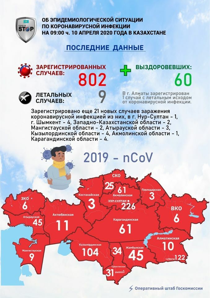«Зарегистрировано еще 21 новый случай заражения коронавирусной инфекцией из них в Нур-Султане – один, Шымкенте – четыре, Западно-Казахстанской области – два, Мангистауской области – два, Атырауской области – три, Кызылординской области – четыре, Акмолинской области – один, Карагандинской области – четыре. (...) Всего в стране подтверждено 802 случая регистрации коронавируса», - говорится в сообщении об эпидемиологической ситуации по коронавирусу на 09.00 10 апреля в Казахстане.