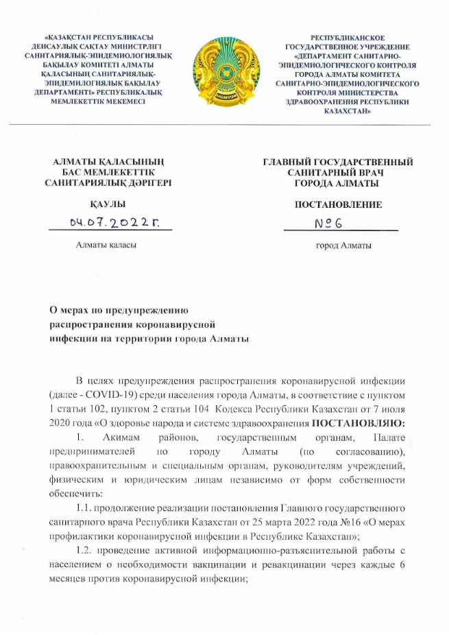Постановление об ужесточении карантина подписал главсанврач Алматы