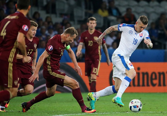 После забитого гола россияне пытались организовать финальный штурм. Моменты сравнять счет были у Василия Березуцкого, Артема Дзюбы и Дениса Глушакова, но в итоге финальный свисток зафиксировал победу словаков.