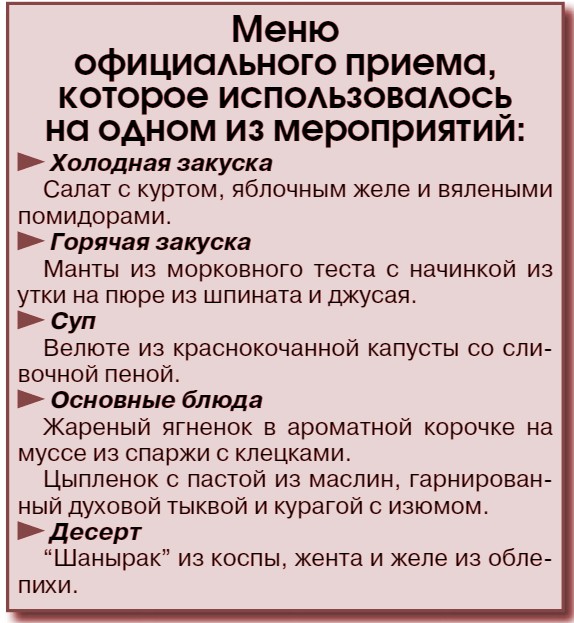 - Конечно, мы стараемся подавать блюда национальной кухни и использовать при этом традиционные продукты, - говорит Канат Бейбитович. - Но при этом все должно выглядеть очень современно и соответствовать мировым стандартам, даже если это бешбармак или куырдак. Например, бешбармак у нас подается порционно, где сочни и мясо чередуются слоями. Иногда присутствуют и спиртные напитки, за исключением случаев, когда делегации прибывают из стран, где не принято их употреблять. Обычно же на столе есть вино или шампанское. Но хочу отметить, что во время официальных мероприятий ни главы государств, ни члены делегаций практически не употребляют алкоголь.