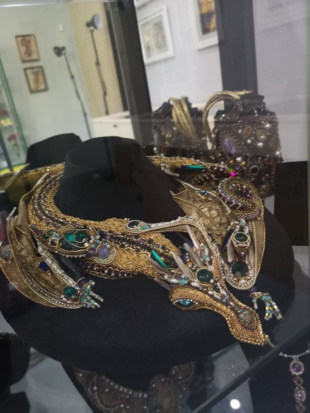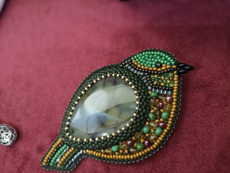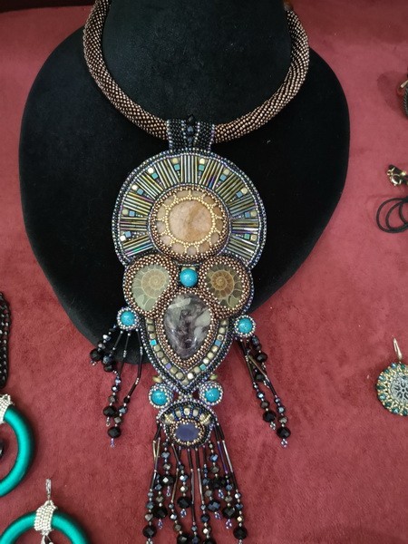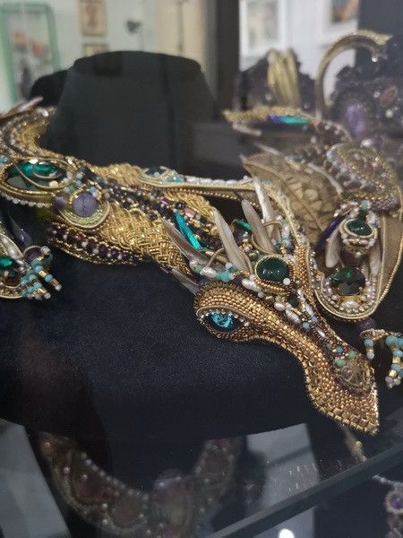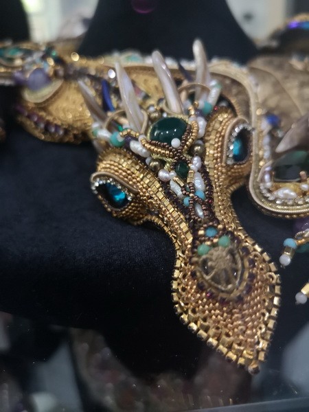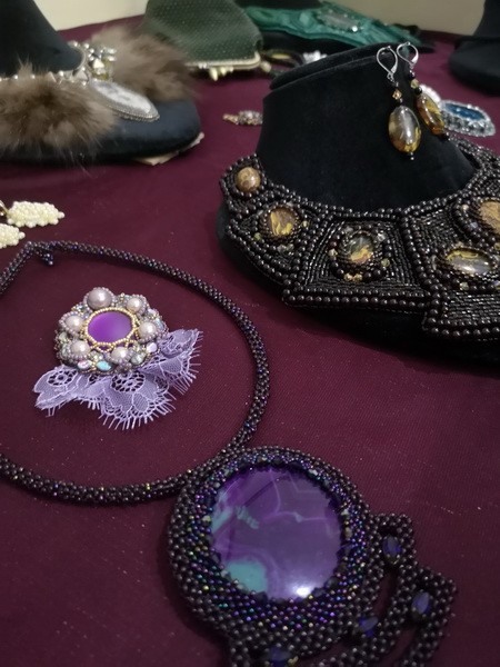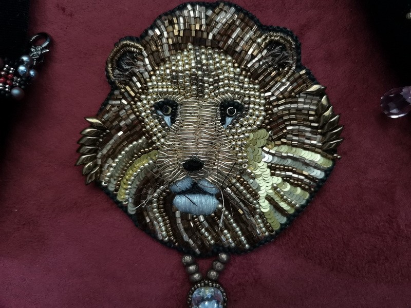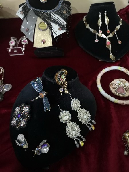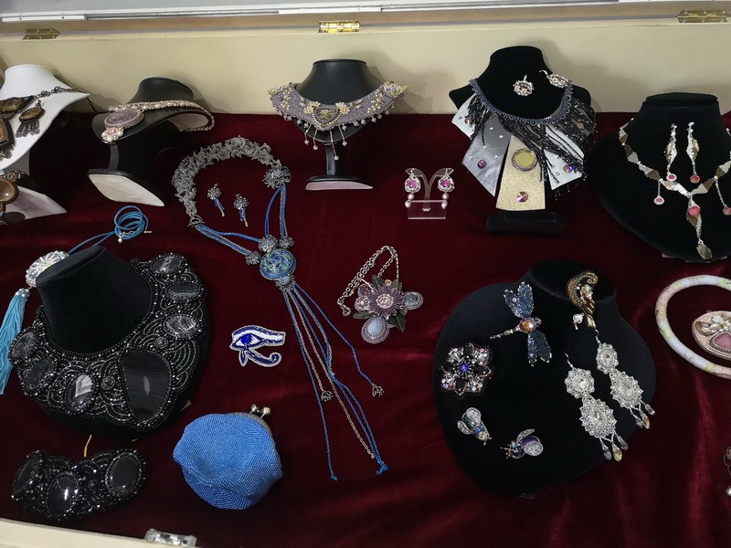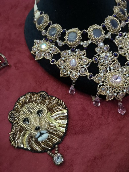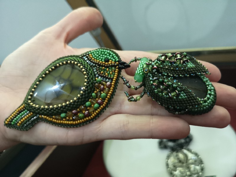 Последнее время стали очень популярны броши из бисера, пайеток, бусинок. На выставке они тоже есть: жуки, блестящие бабочки, причудливые птицы. Есть и по-настоящему художественные работы. Например, морозно-снежное колье со снегирями или сказочный дракон от российской гостьи.